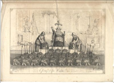 Selten. Dem Blatt wurden laut Nr. 12 die Ausgaben 8 und 9 von der Zensur gestrichen. Die Lithographien zeigen "Chinesische Reue" (eine Schar sich verneigender Chinesen sreckt ihre Zöpfe gen Himmel, während sich vor ihnen Folter- und Hinrichtungsszenen abspielen) und "Ein Gerichtsdirektor hält mit besetzterGerichtsbank Inspection" (Wortwitz: Der Direktor trägt die Bank mit schlafenden geschworenen auf der Schulter, währen er einen aufgebrochene Fensterladen inspiziert).